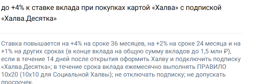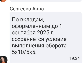 chvi Опубликовано 4 Сентября, 2025 в 16:49 Опубликовано 4 Сентября, 2025 в 16:49 В 29.08.2025 в 20:02, chvi сказал: С 1 сентября вводятся новые условия по тратам по карте Халва для получения повышенной ставки по вкладам. Для обычной Халвы - 10 покупок на сумму 20 т руб Для социальной Халвы -10 покупок на сумму от 10 т.руб. На сайте уже есть новые условия для повышенной ставки по вкладам. Сейчас общалась в чате по поводу новых правил по супербонусам. У меня до сих пор шкала 5 покупок и 5000 руб. В чате получила такой ответ Так что для повышенной ставки по уже оформленным вкладам у меня условия старые. Цитата