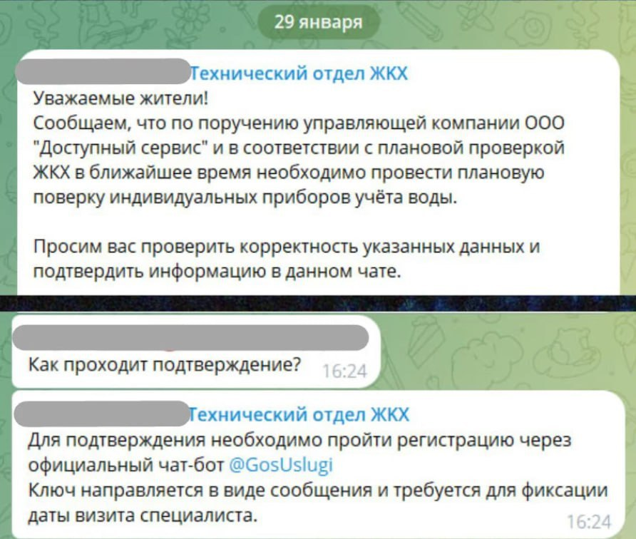 bk003 Опубликовано 2 Февраля, 2026 в 17:46 Опубликовано 2 Февраля, 2026 в 17:46 Скриншоты чат-бота, с помощью которого мошенники получают доступ к аккаунтам Госуслуг. Ссылка на чат-бот распространяется в поддельных домовых чатах. Мошенники пишут, что «в связи с плановой проверкой ЖКХ в ближайшее время необходимо провести плановую поверку индивидуальных приборов учёта воды».