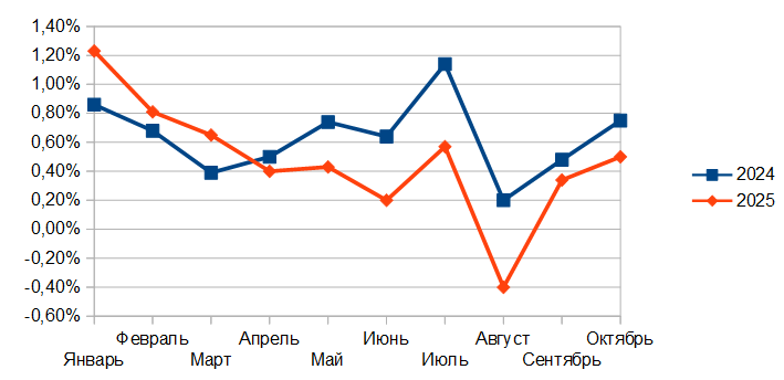 investor Опубликовано 15 Ноября, 2025 в 07:22 Опубликовано 15 Ноября, 2025 в 07:22 Вчера вышли данные по инфляции за октябрь, они оказались позитивными, ниже ожиданий. До следующего заседания по КС выйдут ещё данные за ноябрь, поэтому прогнозы пока делать рано. https://rosstat.gov.ru/storage/mediabank/174_14-11-2025.html Linel 1