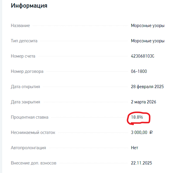 oppana Опубликовано 1 Сентября, 2025 в 13:28 Опубликовано 1 Сентября, 2025 в 13:28 Пополнила вклад на 1 млн Морозные узоры и ставка стала 18,8%, помню мы гадали, тк в договоре написано п.5 - 18,6% годовых, фиксированная на весь срок договора. Я в договоре ставила карандашом 18,8%? Вот на практике подтвердилось увеличение ставки))) Bankov 1 Цитата