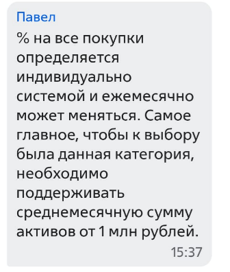 chvi Опубликовано 26 Октября, 2025 в 13:01 Опубликовано 26 Октября, 2025 в 13:01 Сейчас обратилась в чат по этой категории. Ответ получен такой Получается,что вы исключение .У меня у сына долго не было этой категории,в июле открыл вклад МИХХ на 1 млн и только сентябре ему была предложена эта категория ,но с 1% .Чтобы за нее хоть кому давали 3% ,да еще без наличия денег на счетах -таких не встречала вообще.Да и это противоречит условиям программы лояльности Цитата