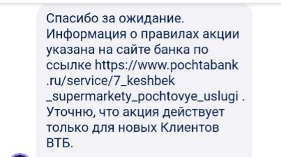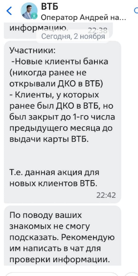chvi Опубликовано 2 Ноября, 2025 в 19:31 Опубликовано 2 Ноября, 2025 в 19:31 В 02.11.2025 в 21:26, chvi сказал: Почему у меня нет такого предложения,непонятно. Сейчас задала вопрос в чате, почему у меня нет предложения по получению 7% кешбека .Получила такой ответ Но это же неверно. Все мои знакомые получили такое предложение,хотя являются клиентами ВТБ банка. Цитата