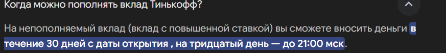 Linel Опубликовано 29 Декабря, 2024 в 11:07 Опубликовано 29 Декабря, 2024 в 11:07 В 29.12.2024 в 13:38, leo messi сказал: Сохранять - имеется ввиду не снижать (в смысле, не закрывать вклад)? Пополнить дополнительно же можно? Можно В 29.12.2024 в 13:38, leo messi сказал: Это раньше было условие про 0.5% ? А ограничение таким же и было - Макс 2000₽ , или было больше (4000?)? Было 0.5% и максимум 2000. В 29.12.2024 в 13:38, leo messi сказал: Я так понял чтобы сейчас получить максимум 2000, нужно в течение первых 7 дней, включая день открытия, закинуть на вклад суммарно 800000? Правильно поняли В 29.12.2024 в 13:38, leo messi сказал: А через какое время появляются в МП ваши приглашения? Дня через 2-3 В 29.12.2024 в 13:45, leo messi сказал: Особо нет смысла. Т к если открыть непополняемый на 2 года, то и пополнить его придется в течение 30 дней на Макс сумму примерно 1 АСВ (иначе зачем тогда его открывать?), но тогда и в будущем не получится пополнять пополняемый вклад без превышения АСВ. У людей разные суммы вложений. И это совсем не обязательно 1 АСВ. У кого-то может быть сейчас всего 500 тыс, а пополняемый вклад он может добивать до АСВ почти 2 года. В 29.12.2024 в 13:47, leo messi сказал: Но ставка по пополняемому в любом случае крайне низкая - на 2 года всего 14% , солид же даёт такой же вклад под 20.5% Вам повезло, что в вашем городе есть этот банк. Но он представлен всего в 8 городах страны. Цитата