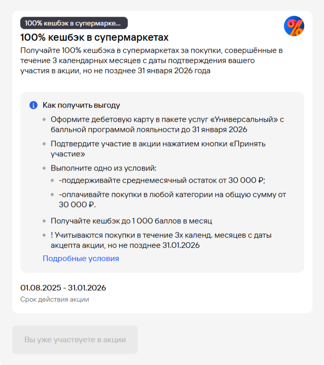 Linel Опубликовано 4 Октября, 2025 в 15:05 Опубликовано 4 Октября, 2025 в 15:05 Вчера мужу пришло на почту письмо от Газика: Получите больше выгоды от вашей дебетовой карты с кешбэком 100% за покупки в супермаркетах. Расплачивайтесь дебетовой картой Газпромбанка в продуктовых магазинах и возвращайте до 1 000 баллов за акцию. Как получить баллы? 1 Подтвердите участие в акции в мобильном приложении или интернет-банке 2 Оплачивайте картой покупки в супермаркетах 3 Получите кешбэк до 1 000 баллов в первый месяц Видимо, ГПБ таким образом будит спящих клиентов, у которых давно не было покупок. У меня такого предложения нет, но у меня был НС до конца июля. Может, из-за этого. Хотя под условия акции я подхожу. Нашла вот что: Условия маркетинговой акции «Кешбэк в супермаркетах для своих» с 1 октября, акция для неактивных клиентов https://www.gazprombank.ru/upload/files/iblock/e31/soty6mfyamrtqgg4b1bs4kp58d4ysmqn/Usloviya-aktsii_Keshbek-v-supermarketakh-dlya-svoikh.pdf Присоединиться надо, нажав на баннер в МП. Как я понимаю, за весь период акции (почти 3 месяца) можно получить всего 1000 руб. Но непонятно, как потом выводить деньги, если даже для компенсации 1:0.8 надо 1500 руб. А лишнее тратить не хочется. У кого-то еще есть такое предложение? oppana 1 Цитата