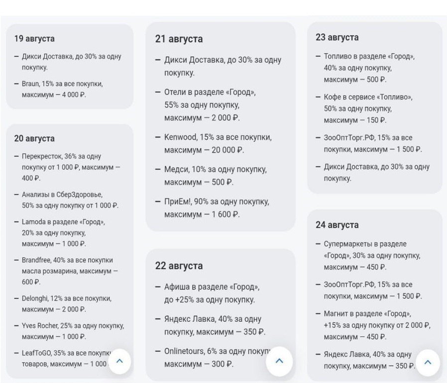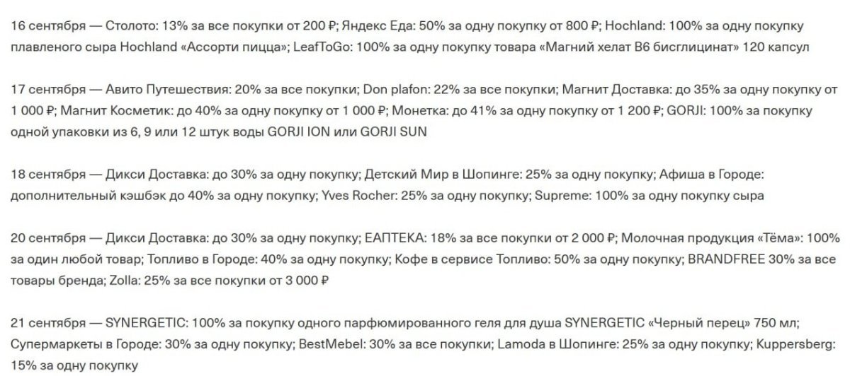 bk003 Опубликовано 1 Сентября, 2025 в 16:46 Опубликовано 1 Сентября, 2025 в 16:46 Расписание кэшбэка на неделю 1 сентября: Монетка: 41% от 1200₽; Перекрёсток доставка: 36% от 1 000₽; SOKOLOV: 20% 2 сентября: Дикси Доставка: до 30%; Braun: 15%; Delonghi: 12% на зерновой кофе 3 сентября: Лента Доставка: 40% от 1500₽; ПриЕм! 90%; Анализы в СберЗдоровье: 50%; Дикси Доставка: до 30% 4 сентября: Подружка: 50%; Отели в Т‑Путешествиях: до 55% за одно бронирование; Туры в Т‑Путешествиях: +2%; Nutribullet: 17% 5 сентября: Афиша в Городе: +25%; Лента Доставка: 40% от 1 500₽; Яндекс Лавка: 40%; Delonghi: 12% 6 сентября: Дикси Доставка: до 30%; ЕАПТЕКА: 18% от 2 000 P; SOKOLOV: 20%; Топливо в Городе: 40%; Кофе в сервисе Топливо: 50%; Л'Этуаль в Шопинге: 30% 7 сентября: Zolla: 25% от 3 000₽; Монетка: 41% от 1 200₽; Яндекс Лавка: 40%; BestMebel: 20% Не забываем открыть предложение перед оплатой. oppana 1 Цитата