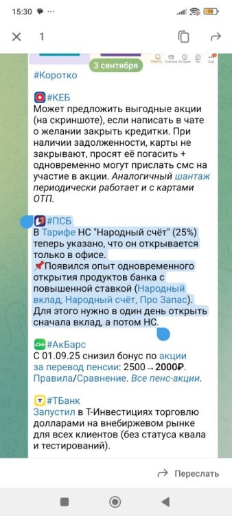 GVV Опубликовано 2 Марта, 2024 в 11:55 Опубликовано 2 Марта, 2024 в 11:55 В 02.03.2024 в 14:41, ef2611 сказал: Подскажите про НС "Про запас" от ПСБ. Сегодня закончился 2-хмесячный период с повышенной ставкой. Открывала 2 декабря. По правилам ПСБ, если день выплаты процентов приходится на нерабочий день, то проценты выплачиваются в первый рабочий день, т.е. 4 марта в понедельник. Выводить деньги со счёта сегодня можно (не закрывая счёт), проценты не потеряю? можно выводить... не потеряете ef2611 1 Цитата