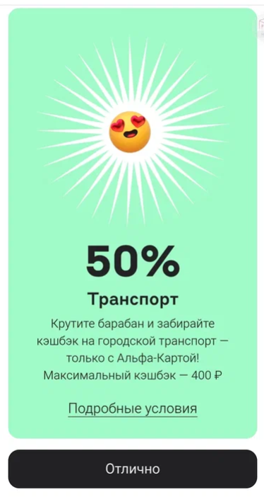 Linel Опубликовано 12 Января, 2024 в 11:31 Опубликовано 12 Января, 2024 в 11:31 15 часов назад, Oleg FRS сказал: А какой кешбэк от Альфы вам особенно запомнился? Я с удовольствием пользуюсь кешбэком в 30-50% на развлечения последние три-четыре месяца. Регулярно покупаю билеты в театр со значительной скидкой. Мне понравилась акция 10% на оплату стикером/Alfa pay. Мы с мужем получили хороший кэшбэк, учитывая, что в эти два месяца нам попадались очень нужные категории, в том числе на барабане. Oleg FRS 1 Цитата