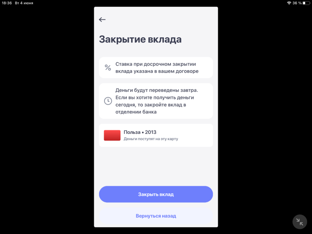 F.R Опубликовано 6 Ноября, 2024 в 10:45 Опубликовано 6 Ноября, 2024 в 10:45 Подскажите, пожалуйста. Поступило СМС: «В связи с тех работами, вклады с датой завершения с 9 по 11 ноября будут закрыты/пролонгированы на новый срок 12 ноября. При необходимости вы можете закрыть вклад с 6 по 8 ноября без потери %». У меня вклад заканчивается 10 ноября. При попытке закрыть вклад, указывается, что «Ставка при досрочном закрытии вклада указана в договоре». Т.е. подтверждения, что вклад будет закрыт без потери % нет. Можно ли всё-таки закрыть вклад без потери %? Цитата